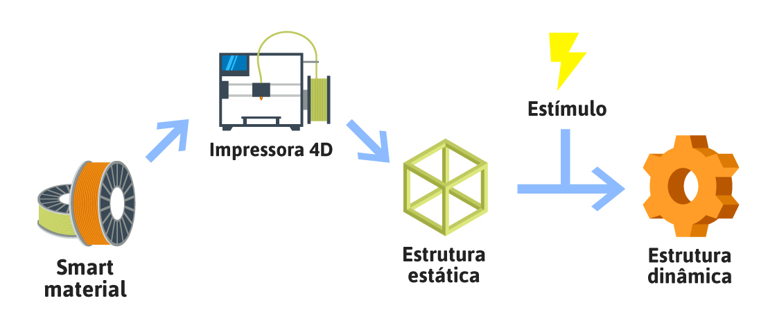 A impressão 4D imprime da mesma forma do que a 3D, só que fazendo uso de smart-materials (materiais inteligentes) e, a partir daí, é gerado um objeto com estrutura estática, porém, essa estrutura, passa a ser dinâmica quando existe algum estímulo externo como temperatura, luz ou água alterando o seu formato.