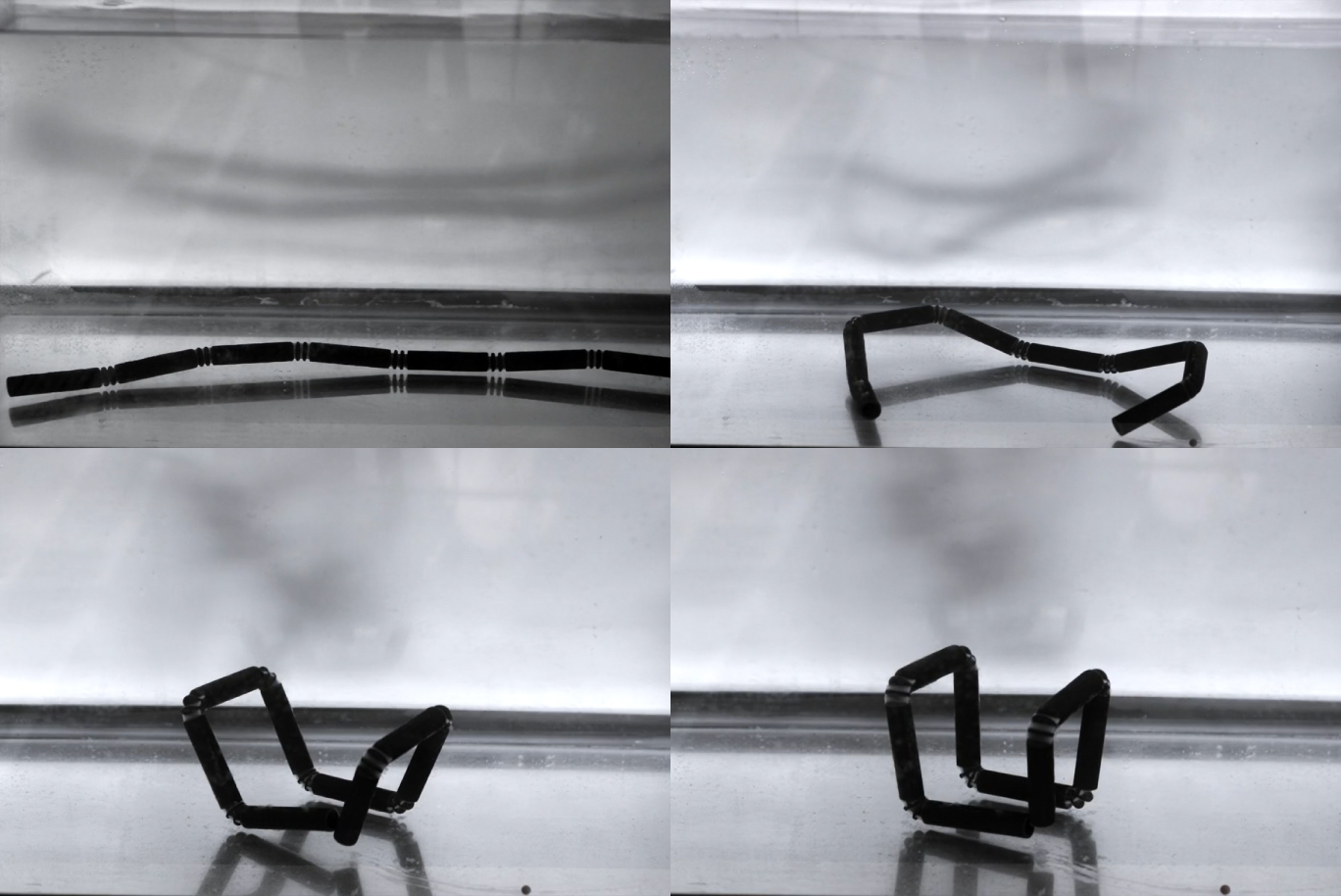A sequência de imagens a seguir mostram um tubo impresso em impressora 4D (figura 1), que exposto a um ambiente com mudança de temperatura e se “contorce” (figura 2 e 3), alterando sua forma até atingir um formato com ângulos retos (figura 4).